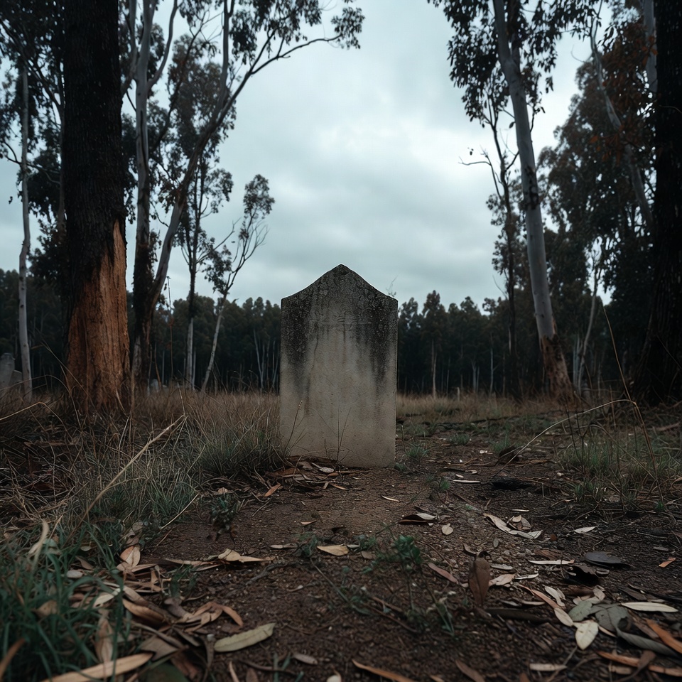 A weathered gravestone stands in a dry grassy clearing surrounded by tall eucalyptus trees. The trees have peeling bark and scattered leaves on the ground lead toward the stone. A cloudy sky looms overhead in the eerie forest setting.