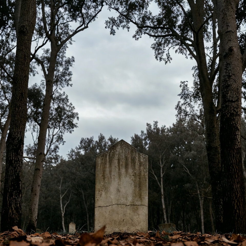 autumn leaves, burial ground, cemetery, cloudy sky, eerie forest, fall foliage, forest, gravestones, gray sky, headstone, isolated background, memorial, mossy stone, overgrown, stone marker, tombstone, trees, woodland cemetery, woods, gravestone