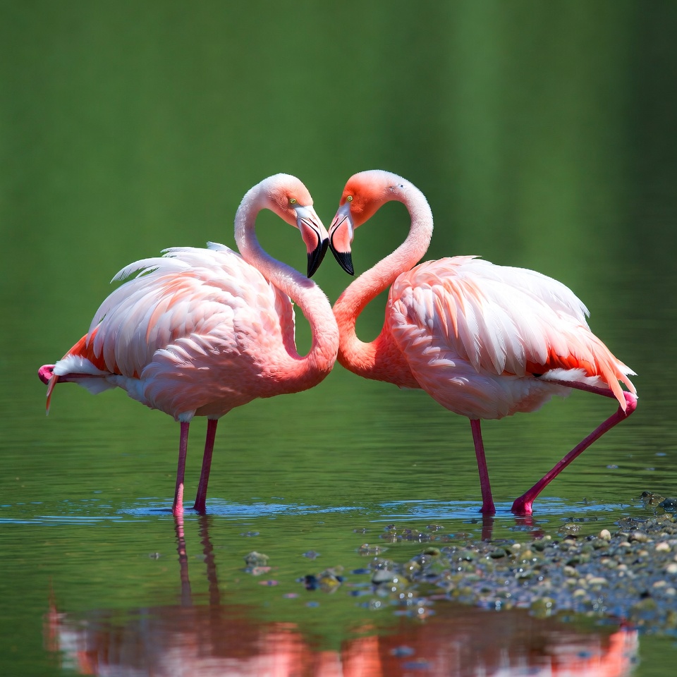 animal photography, birds, curved beaks, exotic birds, feathers, flamingo pair, green background, heart shape, long legs, nature, neck intertwined, pink flamingos, reflection, romantic flamingos, shallow water, standing flamingos, two flamingos, water, wildlife, flamingos