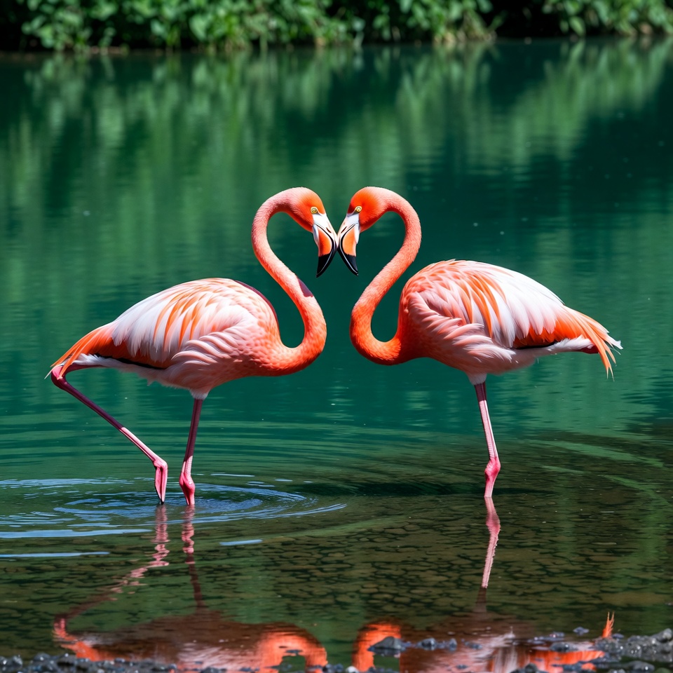 animals, bird photography, birds, curved beaks, feathers, flamingo pair, green water, heart shape, lake, long legs, nature, pink flamingos, reflection, standing flamingos, tropical, two flamingos, water birds, wildlife, zoo animals, flamingos