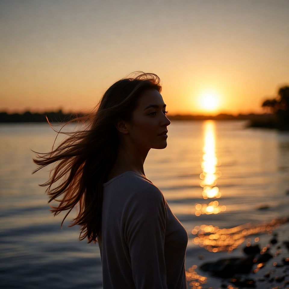 A woman with long flowing hair stands in profile on the lake shore during sunset. Her silhouette is framed against the vibrant orange sky and calm water reflecting the sun. She wears a light-colored sweater and gazes sideways.