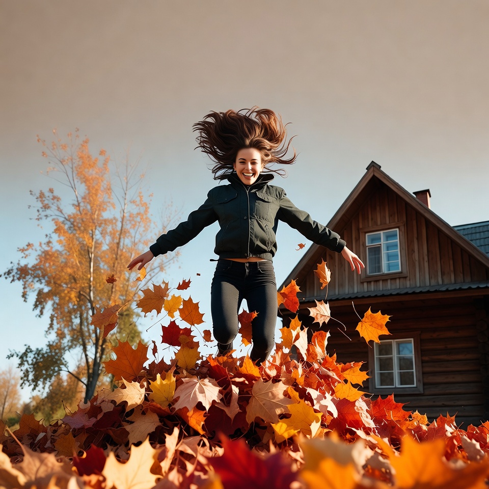 A young woman with long brown hair is joyfully jumping into a large pile of orange and yellow autumn leaves. She wears a green jacket and black leggings, with arms outstretched and hair flying. A wooden house and trees with fall foliage are visible in the background.