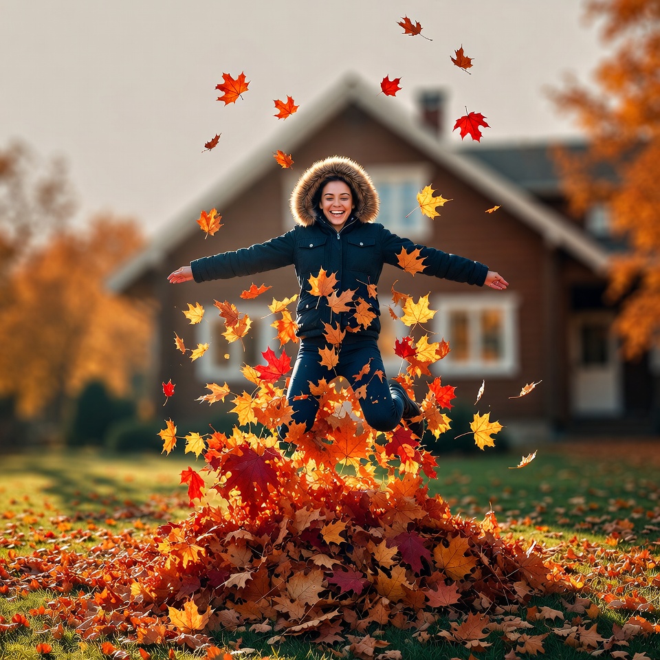 A young woman with curly hair and a fur-lined hooded jacket jumps joyfully in a large pile of red and orange autumn leaves on the grass. Her arms are spread wide, and colorful falling leaves surround her. A wooden house with autumn foliage stands in the blurred background.