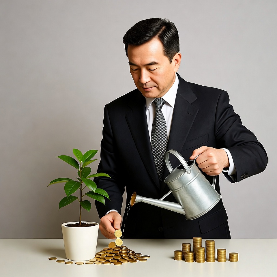 An Asian man in a black suit and tie pours water from a metal watering can onto a small green plant in a white pot. Gold coins are stacked beside the pot on a white table. He stands against a plain gray background.