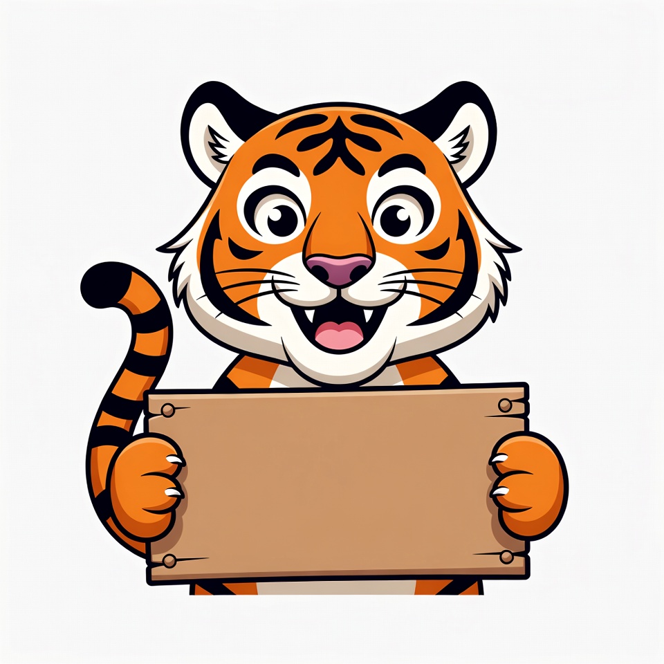animal, big eyes, black stripes, blank sign, cartoon tiger, clipart, cute tiger, empty sign, fun tiger, holding sign, illustration, isolated background, mascot, orange tiger, signboard, smiling tiger, vector art, wildlife cartoon, wooden sign, tiger