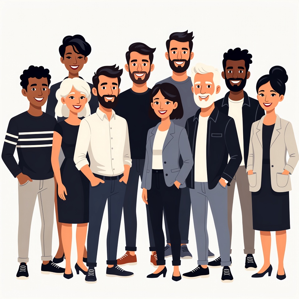 A diverse group of eight professionals, including men and women of various ethnicities, stands together on a white background. They wear modern business casual attire such as suits, dresses, shirts, and pants in neutral colors. The illustration features smiling faces and confident poses with hands in pockets.