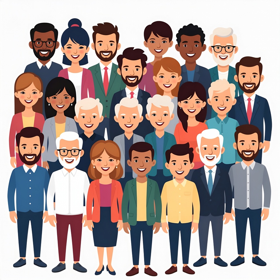African-American, Asian, Latino, White, adults, business attire, crowd, dresses, flat design, group, illustration, men, multiracial, office workers, people, professional clothing, smiling faces, standing, suits, team, vector art, white background, women, diverse group