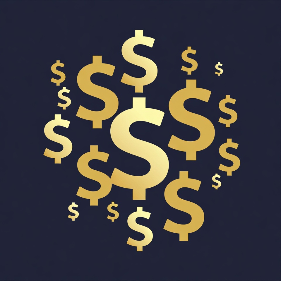 Multiple golden dollar sign symbols are arranged in a scattered circular pattern. They feature a shiny metallic gold color against a deep navy blue background. The design is simple and vector-style illustration.