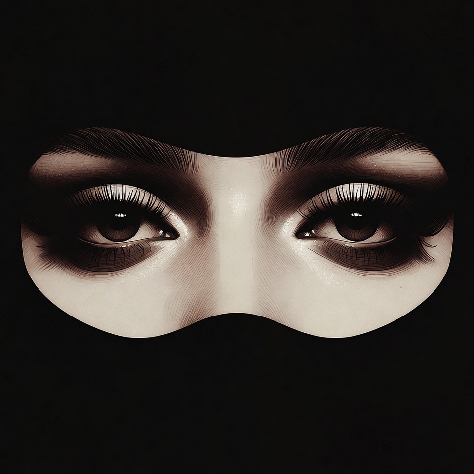 A close-up illustration shows a woman's intense brown eyes framed by long lashes and dark eyeliner. Her face is covered by a black niqab veil, revealing only the eye area against a dark background. The artistic style features smoky makeup and a mysterious gaze.
