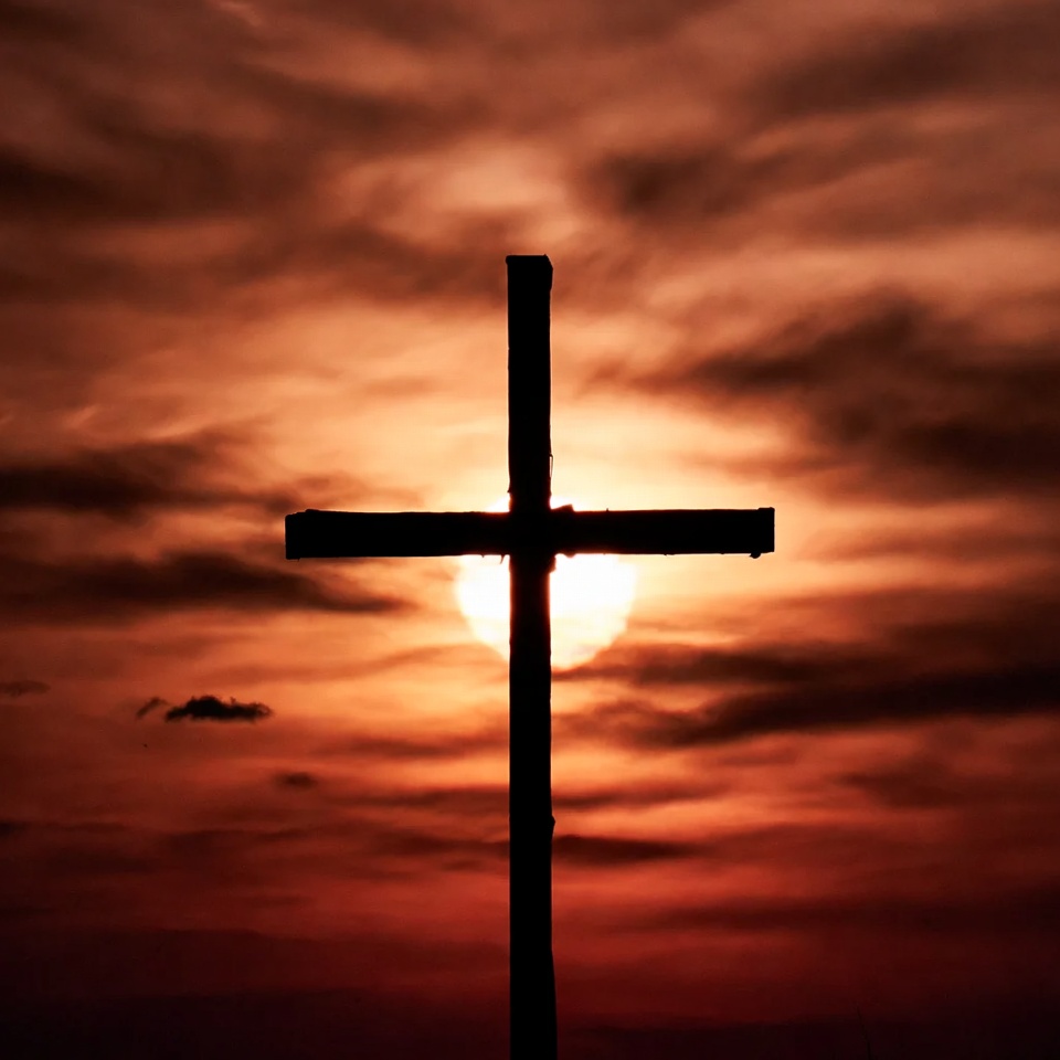 A large wooden cross stands in silhouette against a dramatic sunset sky filled with orange and red hues. The sun glows brightly behind the cross, creating a radiant backlight effect. Dark clouds frame the scene, enhancing the striking contrast.