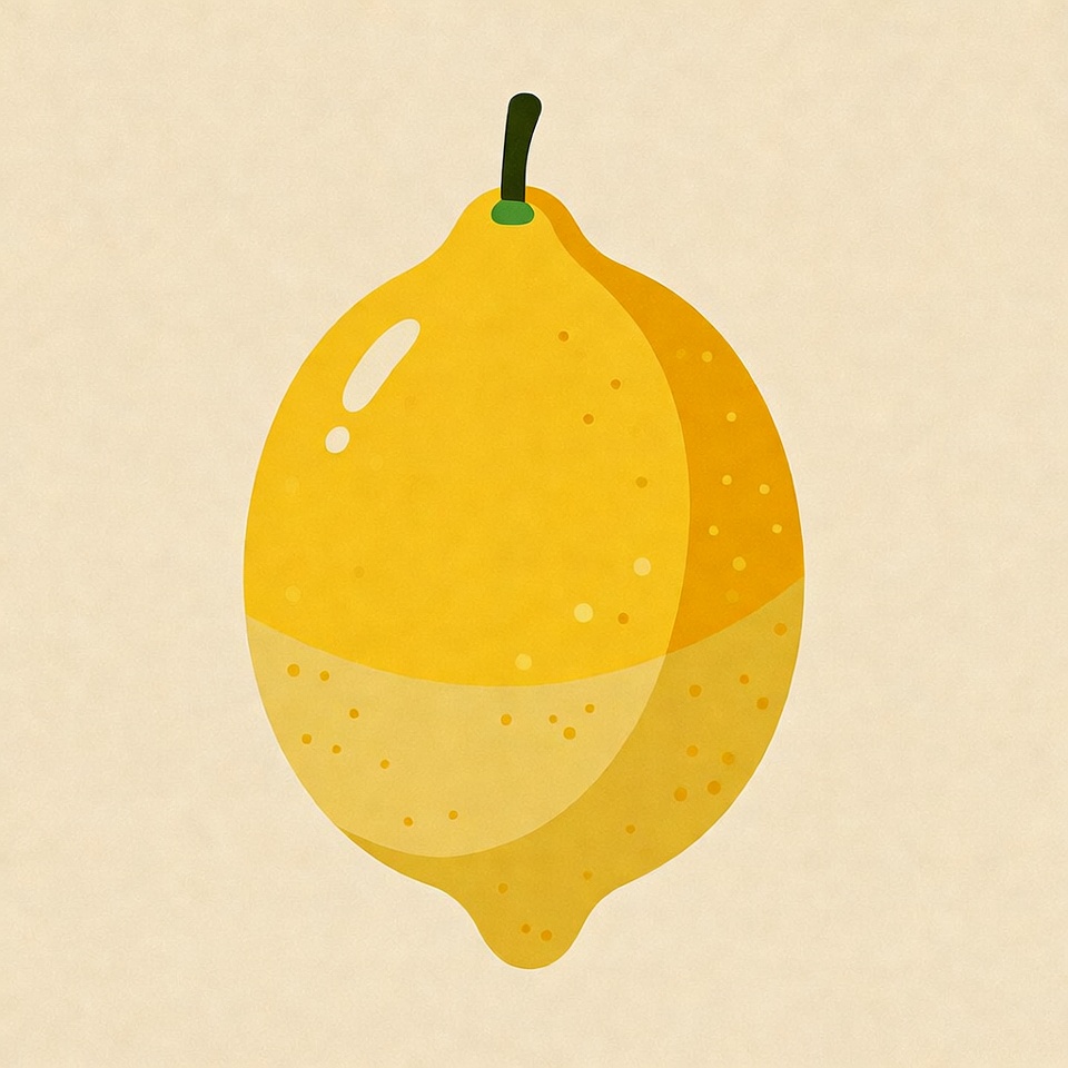 A vibrant yellow lemon illustration with a green stem and leaf on a beige background. The lemon features a glossy highlight and textured shading for a realistic look. It is depicted in a simple, flat design style.