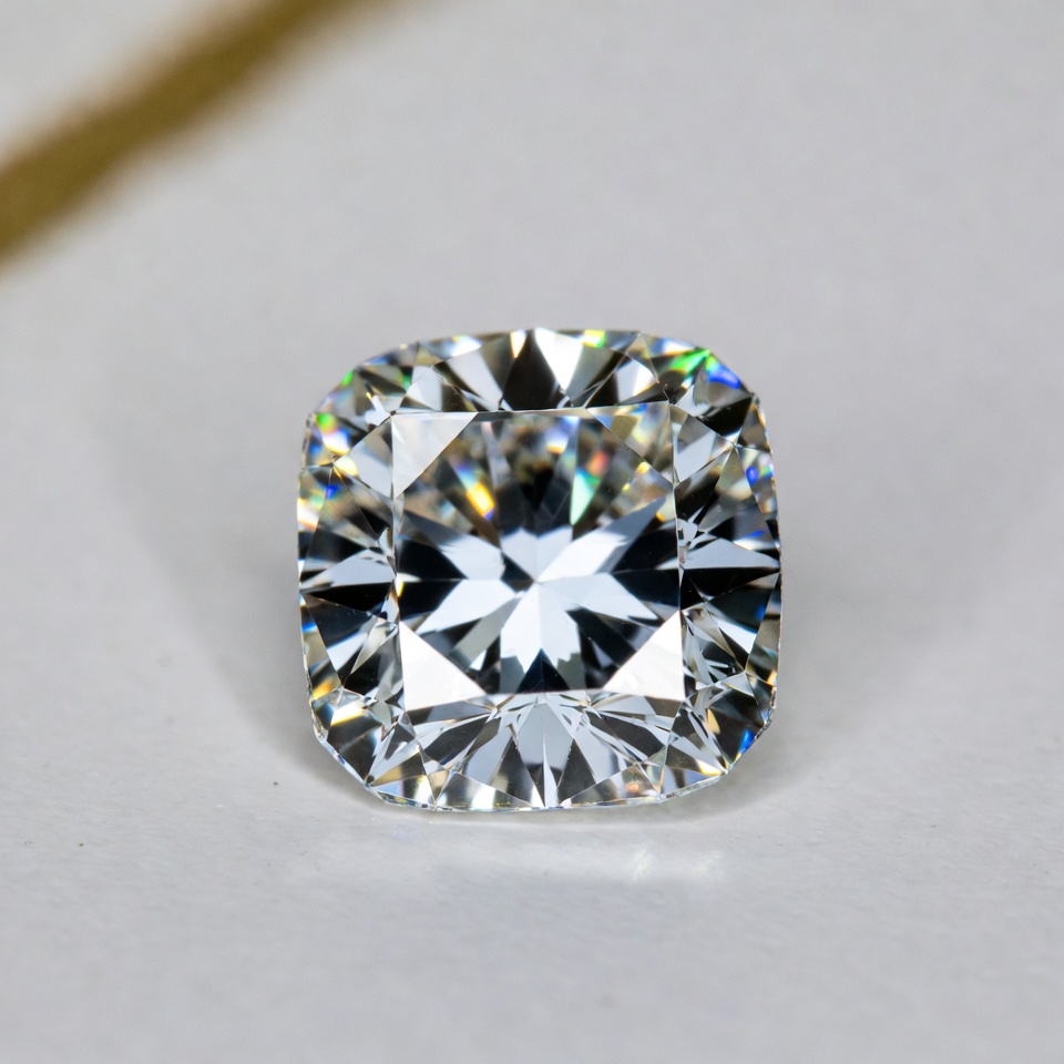 A large square cut diamond with brilliant facets sparkles on a white surface. A thin gold bar is positioned nearby. The gem displays intense fire and clarity.