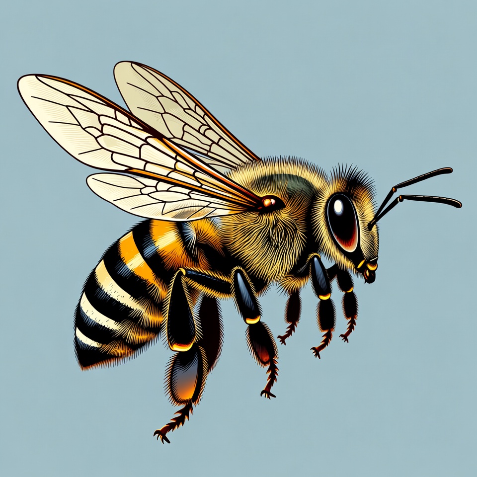 A detailed illustration of a honey bee with black and orange stripes flies against a light blue background. Its wings are spread wide, and large compound eyes are prominently featured. The bee has fuzzy fur and segmented legs.