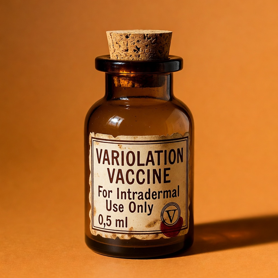 A small amber glass vial with a cork stopper contains variolation vaccine. The label reads 'Variolation Vaccine For Intradermal Use Only 0.5 ml' in vintage-style text. It sits on an orange background with a subtle shadow.