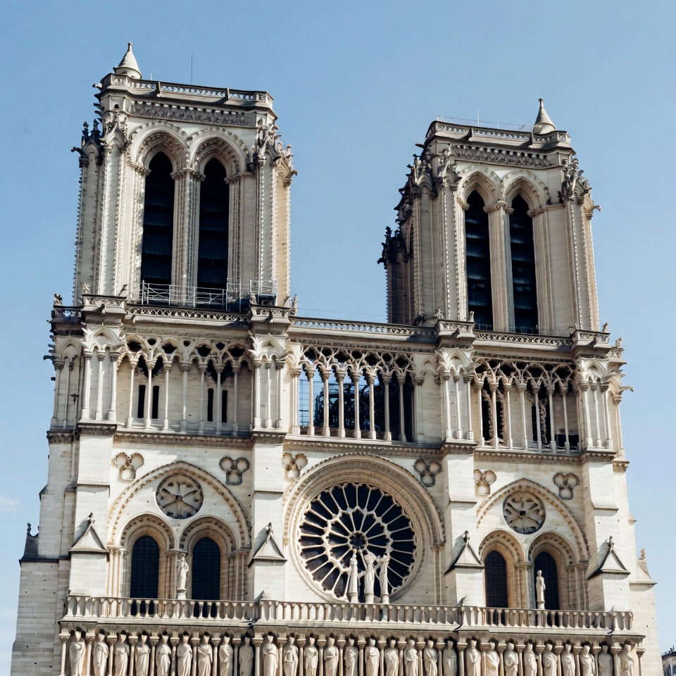 A frontal view of the iconic Notre Dame Cathedral in Paris features its twin Gothic towers and ornate stone facade. The central rose window and detailed arches are prominent under a clear blue sky. Statues line the upper levels of the historic structure.