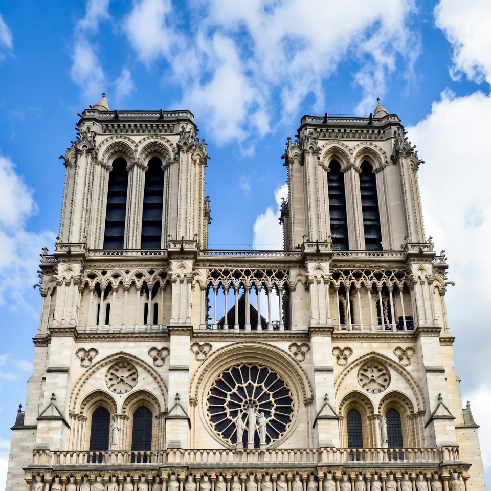 Europe, France, Gothic architecture, Paris, arches, architecture, blue sky, cathedral, church, clouds, facade, famous monument, historical building, landmark, medieval, rose window, spires, stone carvings, tourism, towers, Notre Dame