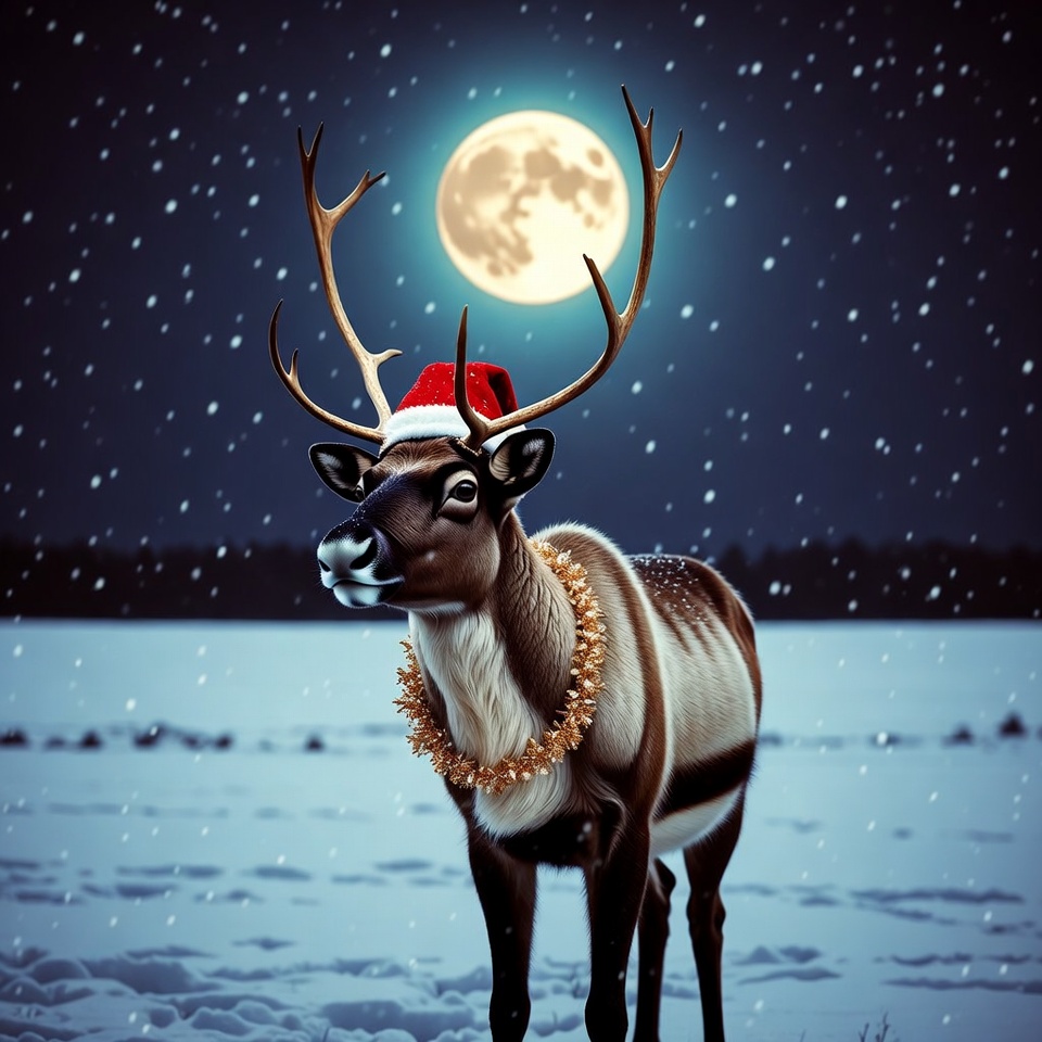 A reindeer with large antlers stands in snowy landscape under a full moon and starry night sky. It wears a red Santa hat and a gold lei necklace. Snowflakes fall around the isolated animal illustration.
