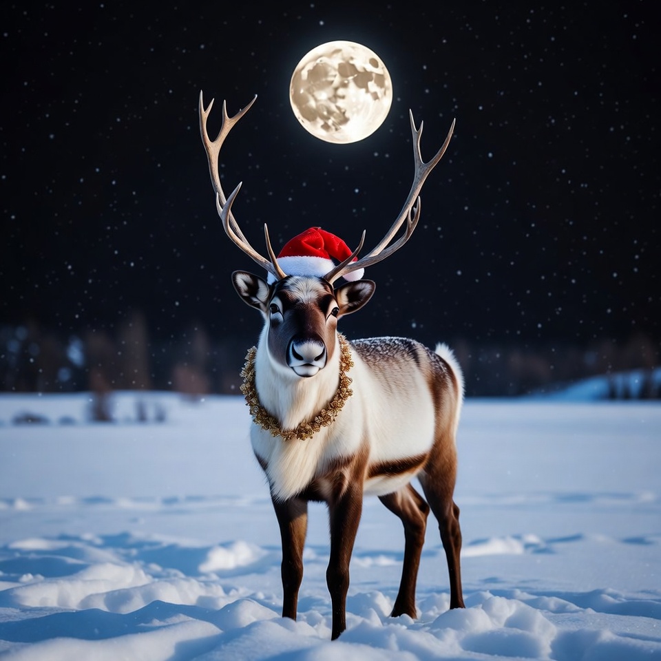 A reindeer with large antlers wears a red Santa hat and gold necklace while standing in snowy landscape. A large full moon shines brightly above its antlers against a starry night sky. Snow-covered trees are visible in the background.