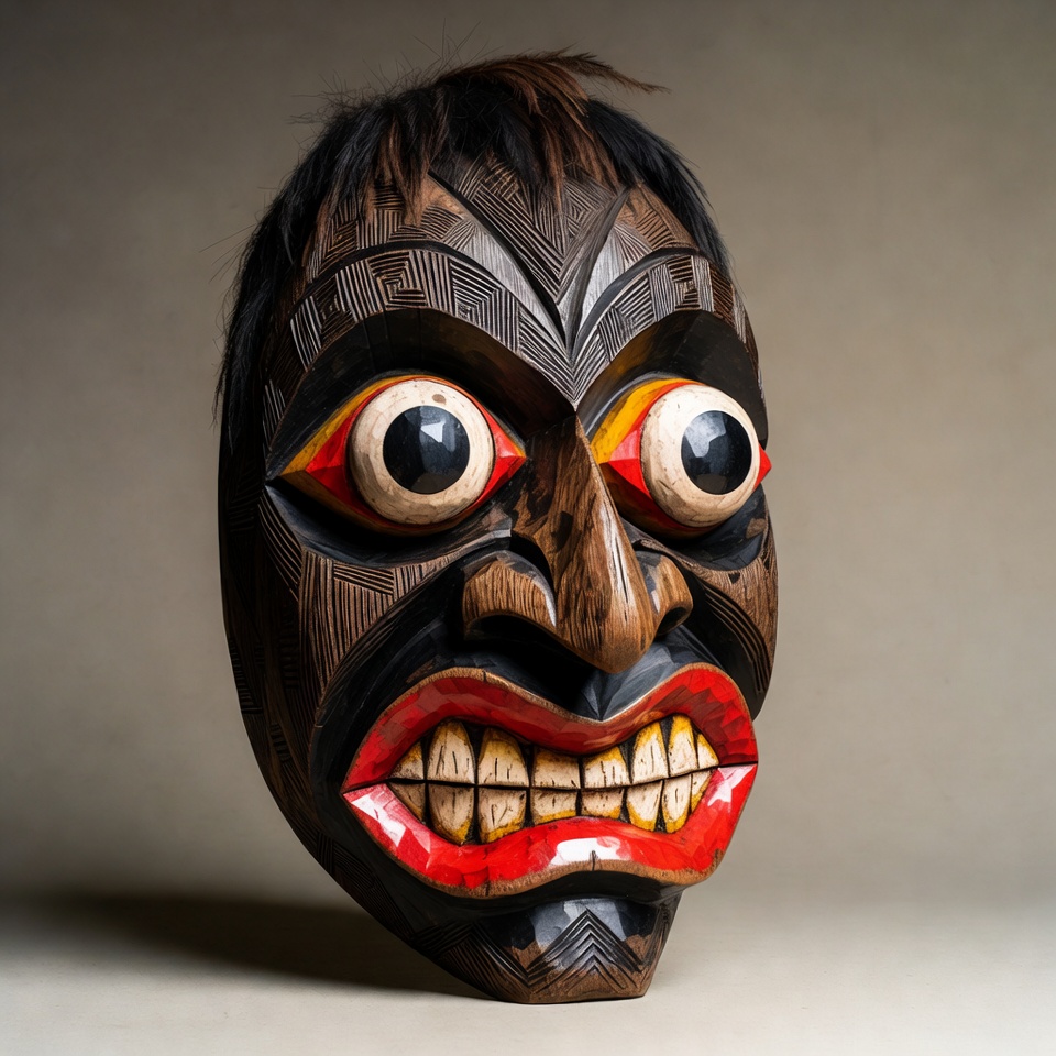 Haida mask, Northwest Coast style, Pacific Northwest art, Tlingit mask, art object, black hair, bulging eyes, carved mask, cultural artifact, dark wood, geometric patterns, indigenous art, isolated background, red mouth, sharp teeth, traditional mask, tribal mask, wooden mask