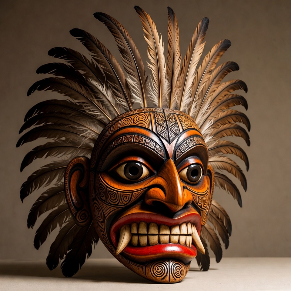 Pacific Islander, brown mask, carved mask, ceremonial mask, cultural artifact, fangs, feathered headdress, feathers, indigenous mask, intricate carvings, isolated background, large eyes, orange mask, tribal art, tusks, wide mouth, wooden mask, tribal mask