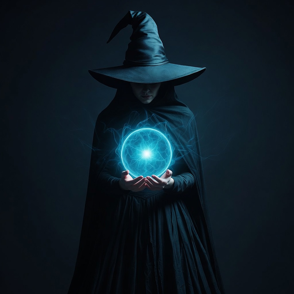 A woman in a black hooded cloak and wide-brimmed witch hat holds a glowing blue energy orb between her hands. She stands against a dark background with blue magical light illuminating her face and the orb's electric patterns. Her expression is mysterious under the hat's shadow.