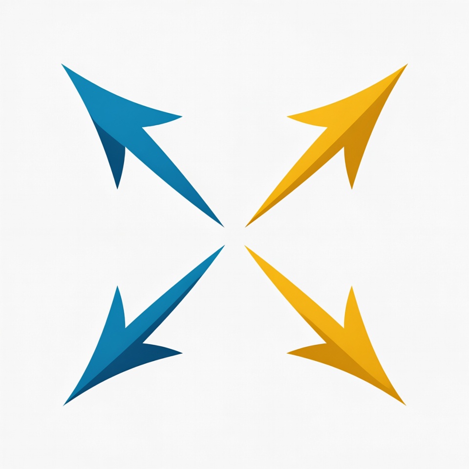 A clipart illustration features four sharp arrows arranged in an X shape on a white background. Two arrows are vibrant blue, pointing up and left, while two are bright yellow, pointing down and right. The design is simple, flat, and isolated for easy use.