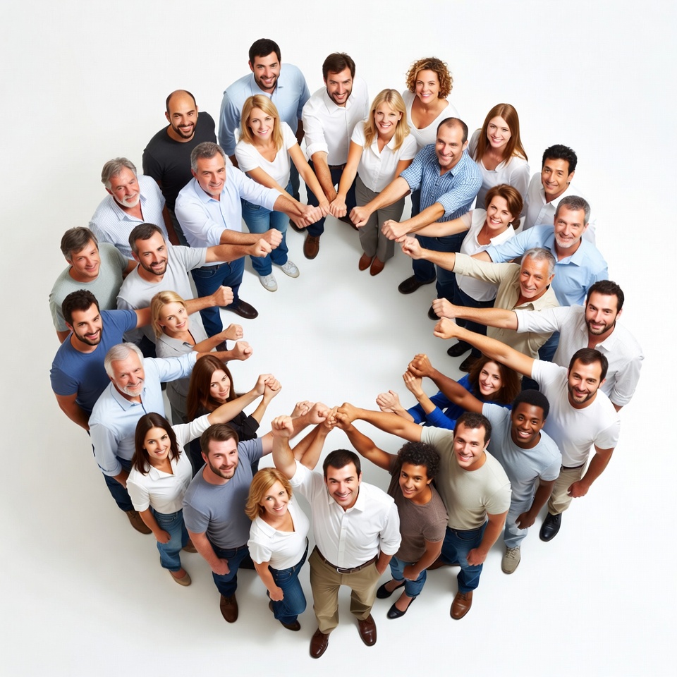 A large diverse group of men and women stands in a tight circle on a white background, holding hands with arms raised. They wear casual business attire including shirts, blouses, and pants in various colors. The overhead view captures the unity of the group from above.