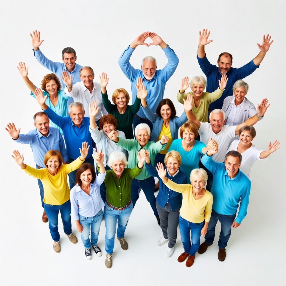 A large group of elderly men and women stands together on a white background, raising their arms to form a large heart shape with their hands. They wear casual clothing in various colors like blue, yellow, and green tops with jeans. The overhead view captures their joyful group unity and diverse expressions.
