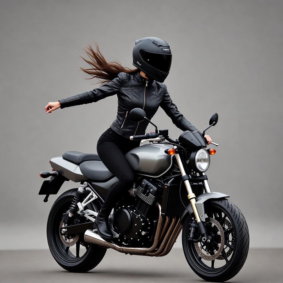 A woman with long flowing hair wears a black full-face helmet and rides a silver sport motorcycle. She is dressed in a black leather jacket, tight black pants, and black boots, with her arms extended dynamically. The scene is set against a plain gray background.