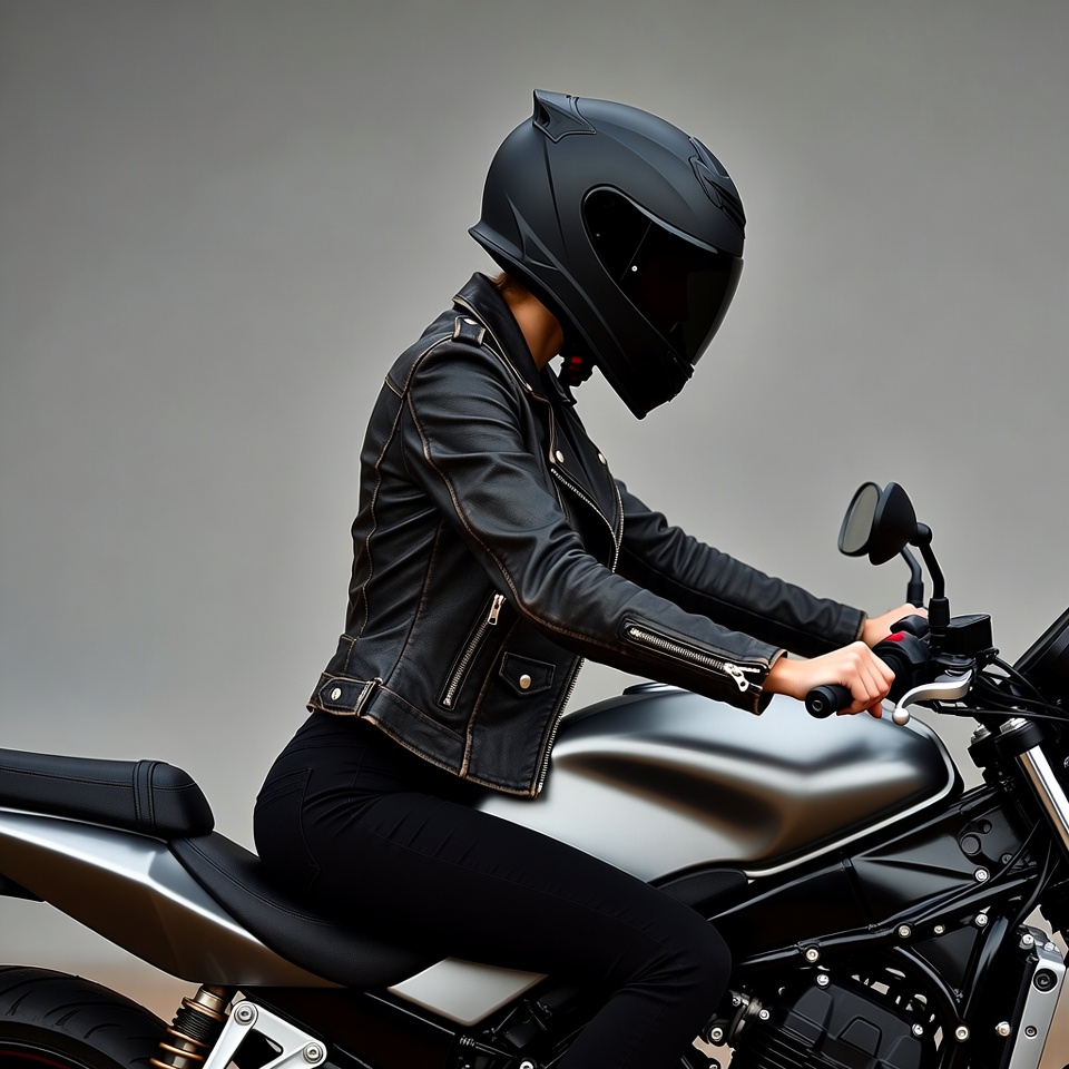 Asian, biker, black helmet, black pants, edgy style, female, full-face helmet, gray background, gripping, handlebars, leather jacket, motorbike, motorcycle, protective gear, rider, riding, seated, silver bike, sport bike, woman