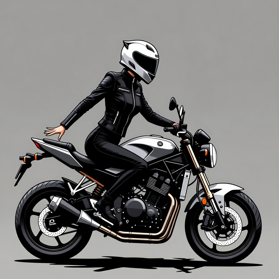 A woman wearing a white helmet and black leather suit sits confidently on a white and black sport motorcycle. She has one hand raised dynamically while gripping the handlebar with the other. The illustration features a clean gray background with a subtle shadow beneath the bike.