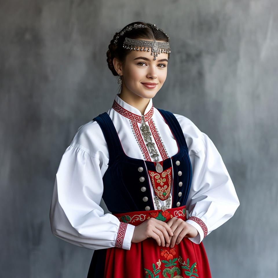 Russian costume, White, braided hair, cultural attire, embroidered dress, ethnic clothing, female, floral embroidery, folk clothing, forehead ornament, gray background, headpiece, navy vest, portrait, puffed sleeves, red skirt, silver buttons, silver jewelry, smiling, traditional dress, white blouse, young woman, woman