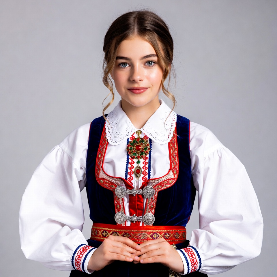 A young White girl with wavy brown hair stands smiling against a gray background, wearing a traditional Norwegian bunad. She has on a white blouse with lace collar and cuffs, a navy blue velvet vest with silver clasps and red embroidery, and a colorful embroidered belt. Her hands are clasped in front of her.