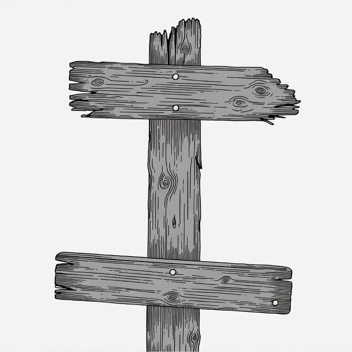 A weathered wooden signpost stands upright with two horizontal planks attached to a central post. The planks show signs of decay with splintered edges and nail holes. It is depicted in a simple line drawing style on an isolated white background.