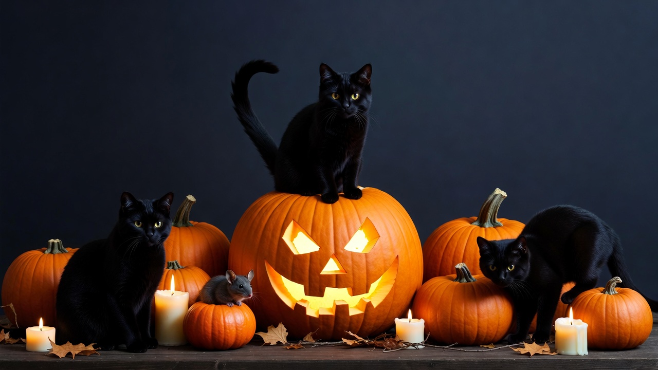 Multiple black cats sit and perch on and around large carved jack-o'-lantern pumpkins with glowing faces. Candles and autumn leaves are scattered on the dark background surface. A small rat peeks from inside one pumpkin.