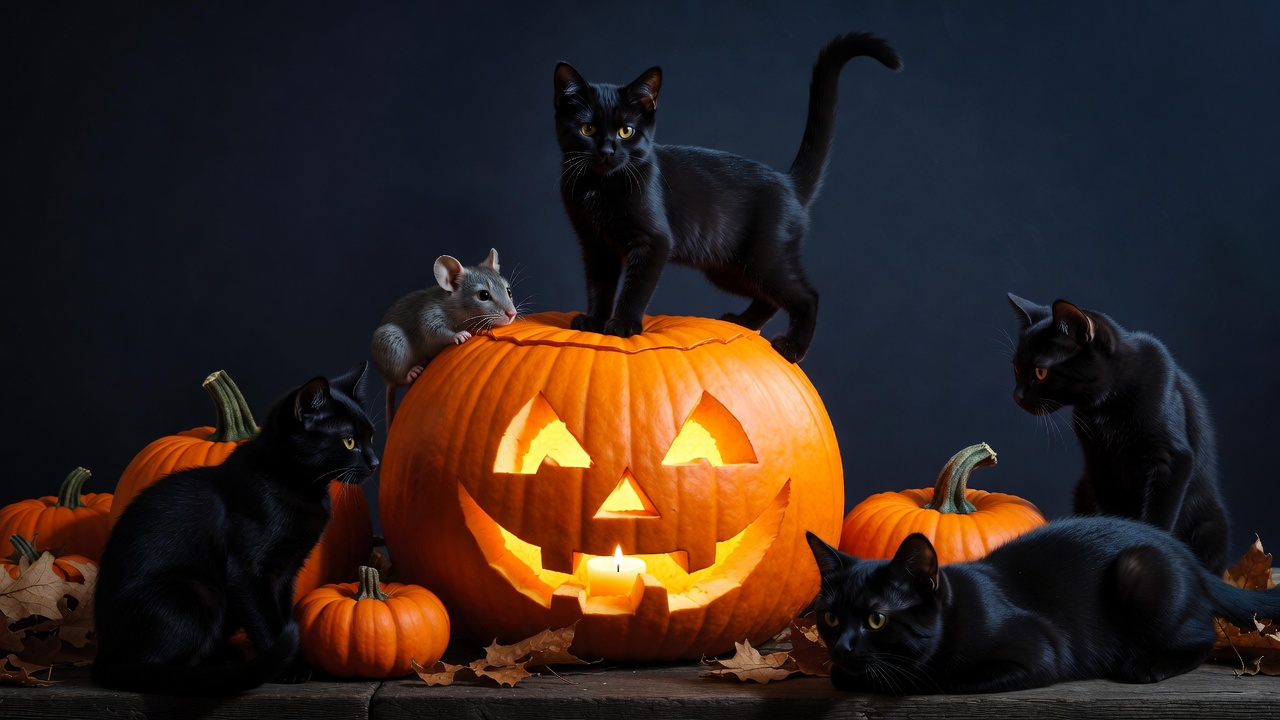 Halloween, Halloween cats, October, autumn leaves, cats, cats on pumpkin, dark background, gray mouse, isolated background, jack-o-lantern, lit pumpkin, mice, pumpkin, small pumpkins, spooky, black cats