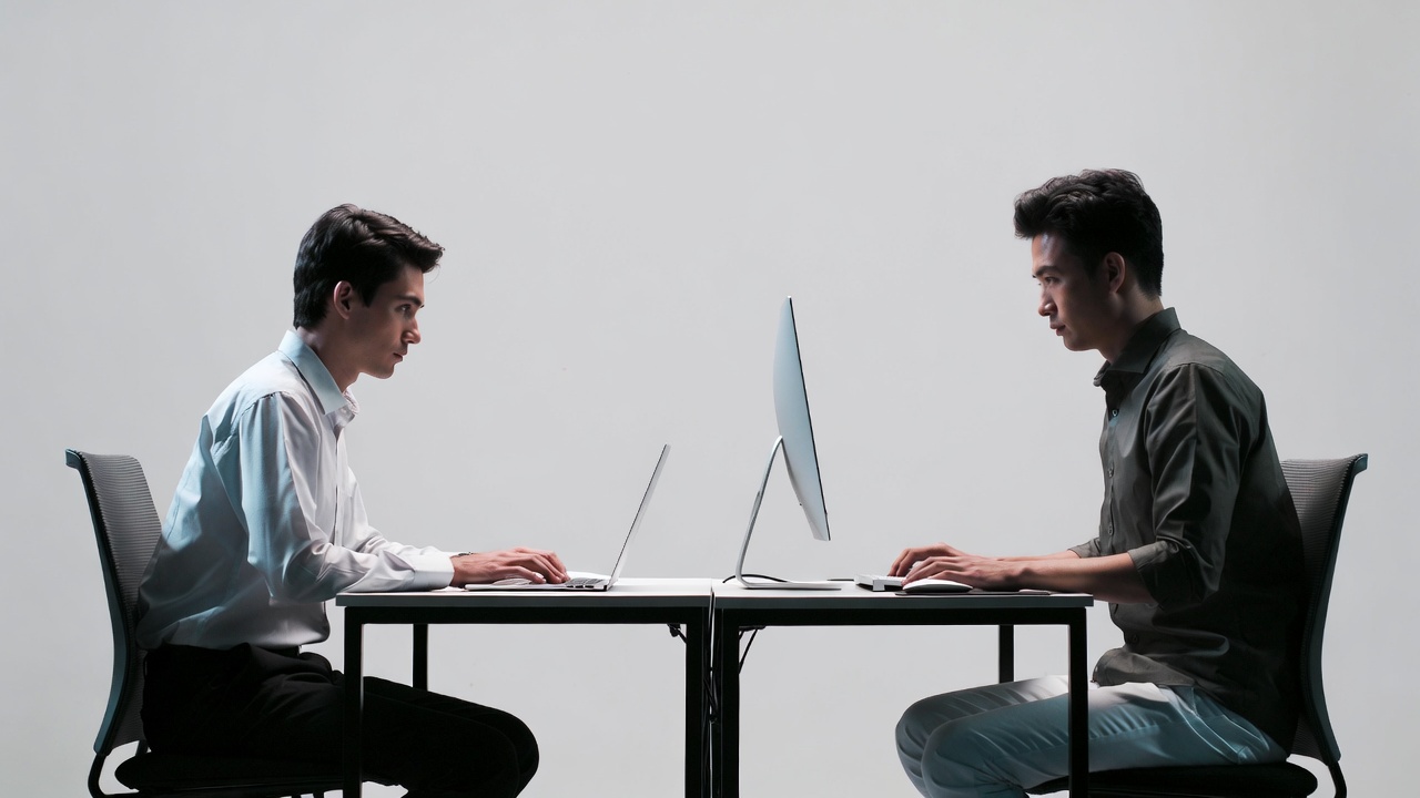 Two young Asian men sit at adjacent desks facing each other, each typing on a laptop computer. One wears a white shirt and black pants, while the other is dressed in a gray shirt and light pants. The scene features a plain gray background with modern office chairs.