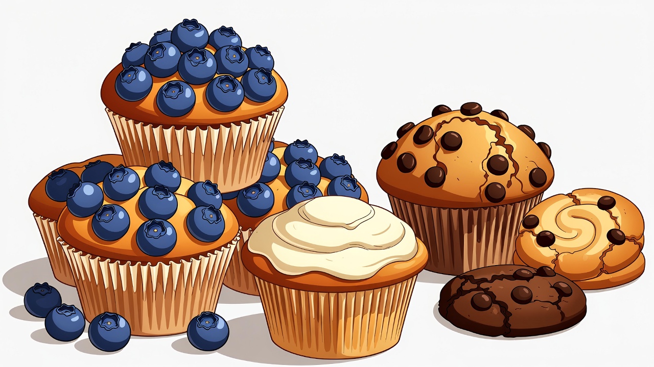 A colorful illustration features a stack of golden muffins topped with blueberries and white frosting. Nearby are additional muffins with blueberry toppings, chocolate chip muffins, and various cookies including chocolate and cream-filled ones. Scattered blueberries add detail on a white isolated background.