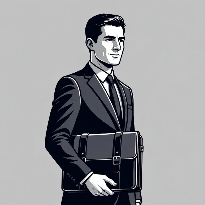 A young man with short dark hair stands confidently in a dark suit, white shirt, and tie. He holds a brown leather briefcase in his right hand. The vector illustration features a minimalist black and white design on a gray background.