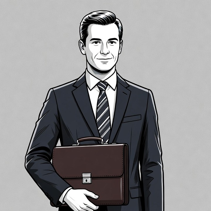 A line art illustration of a smiling man in a dark suit, white shirt, and striped tie stands against a gray background. He holds a brown leather briefcase in his right hand. The drawing features clean black outlines and subtle shading.