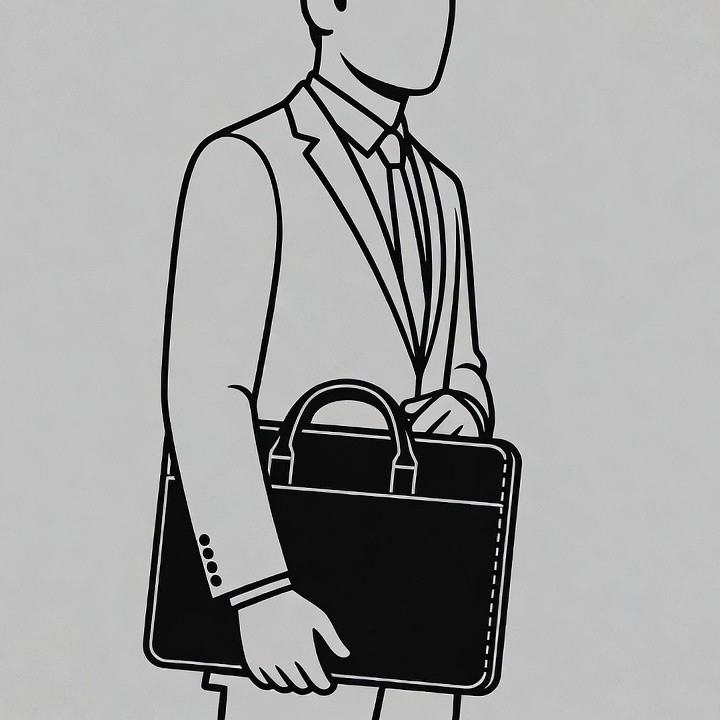A line art illustration depicts a businessman in a suit and tie standing and holding a black leather briefcase in his right hand. He faces slightly to the side on a plain gray background. The drawing uses simple black outlines with minimal shading.