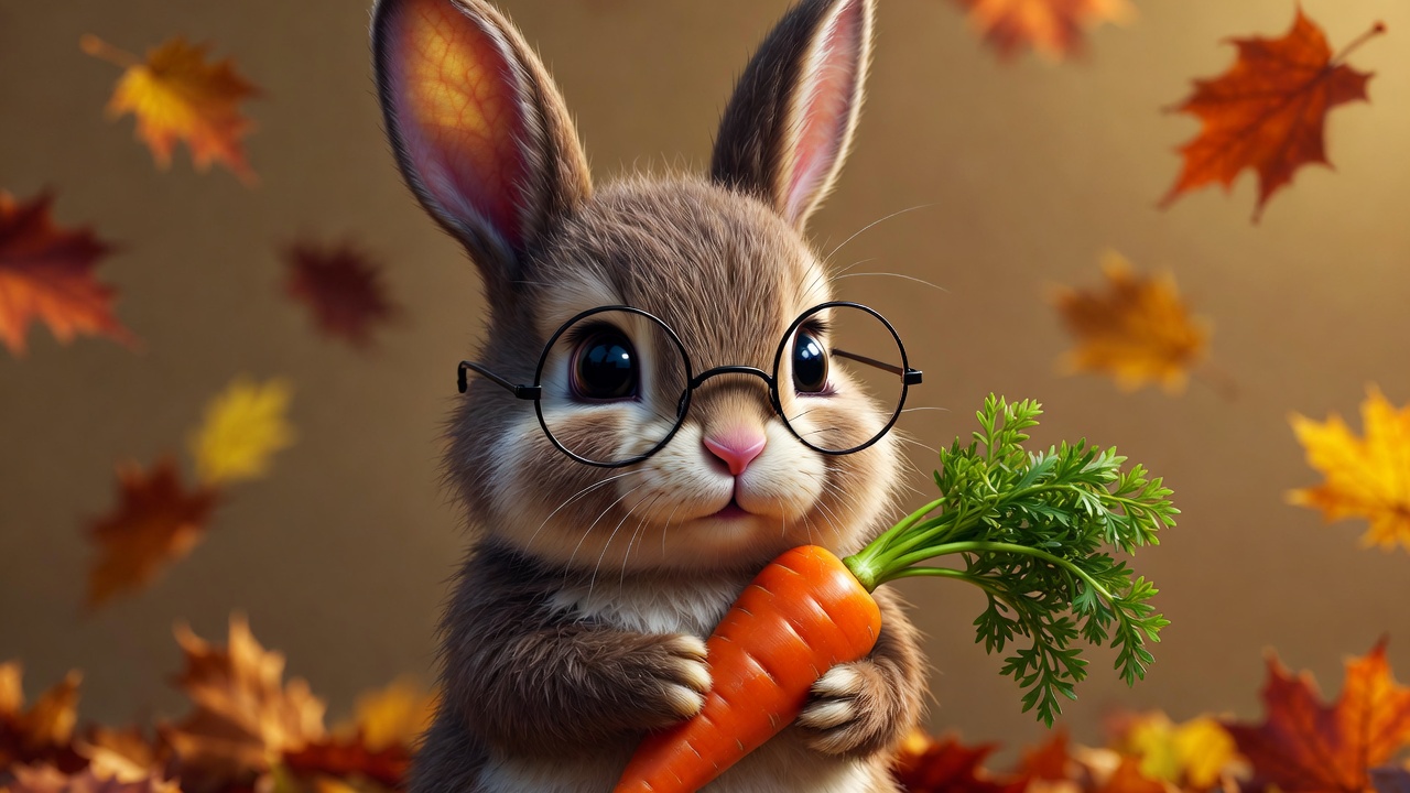 A fluffy brown bunny wearing round glasses holds a fresh carrot with green tops. It stands against a warm autumn background filled with scattered yellow and orange fall leaves. The bunny has large expressive eyes and perked ears.