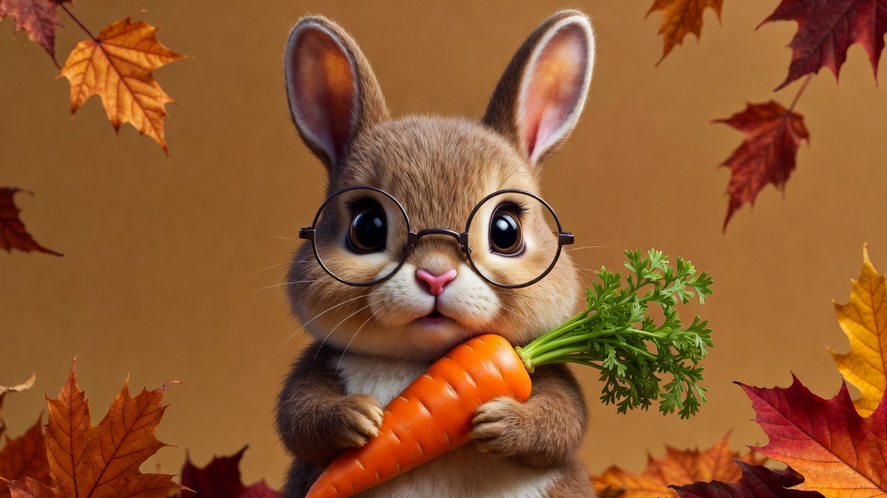 A fluffy brown bunny wearing round glasses holds a fresh orange carrot with green tops. It stands against a warm brown background scattered with falling autumn leaves. The bunny has large expressive eyes and perked ears.