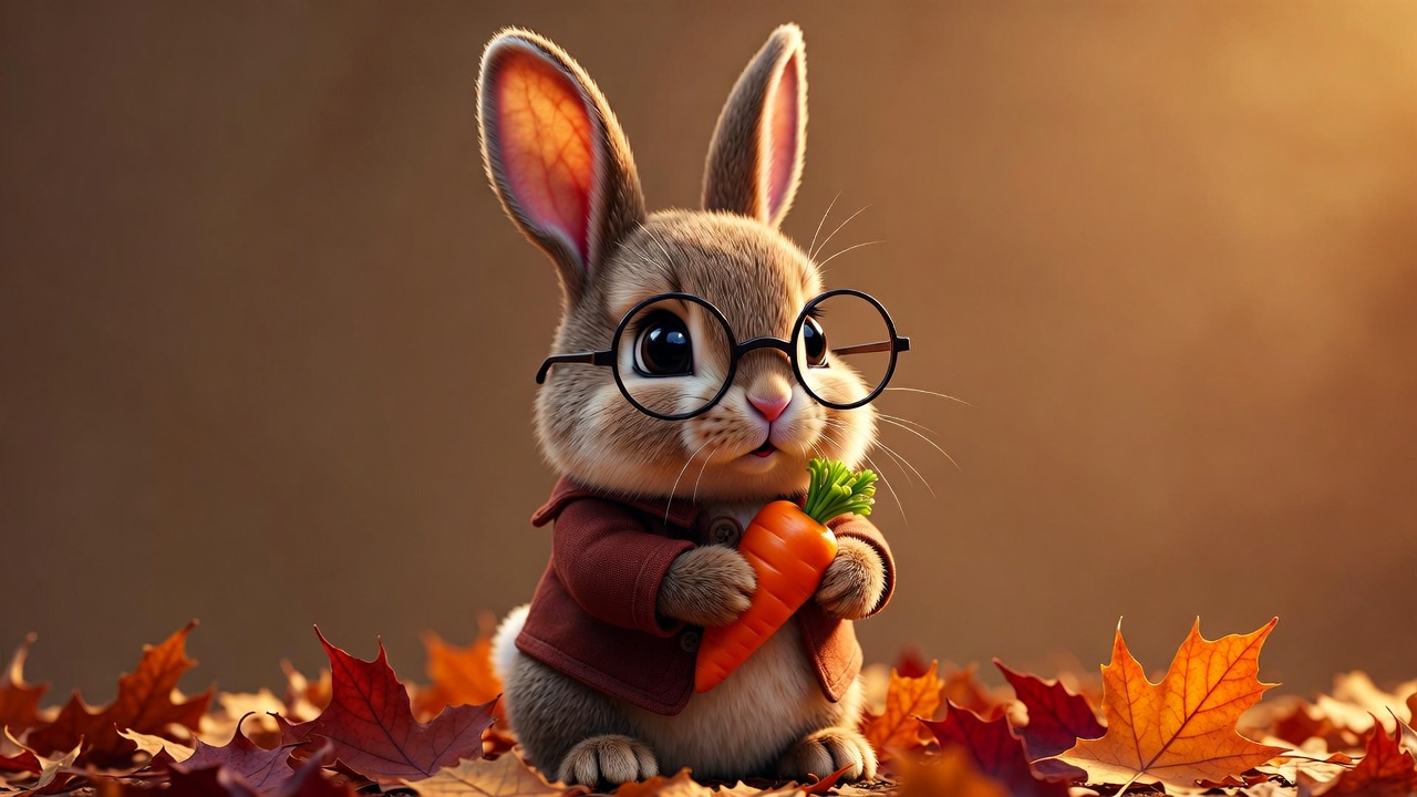 A fluffy brown bunny wearing round glasses and a brown vest holds a fresh carrot with green tops. It stands on a bed of vibrant autumn leaves with a warm golden-hour glow. The rabbit has large expressive eyes and perked ears.