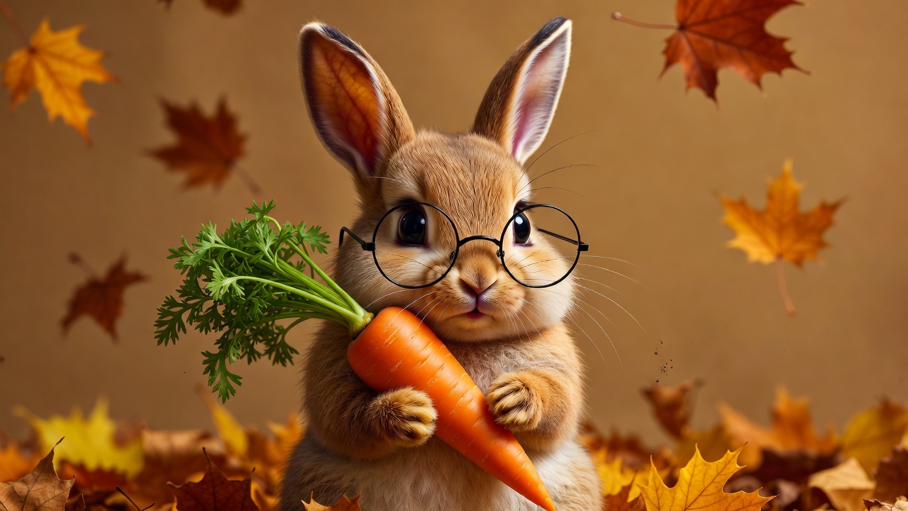 A cute brown bunny wearing round glasses holds a fresh carrot with green tops. It sits on a bed of fallen autumn leaves with more orange leaves floating around. The background is warm brown, emphasizing the fall theme.