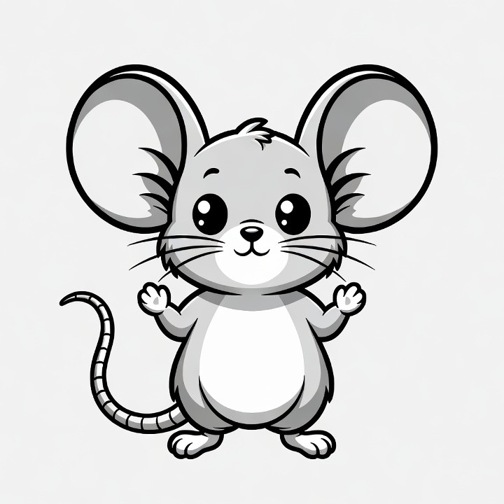 A kawaii-style cartoon mouse stands on a white background with oversized ears, large sparkling eyes, and a cheerful smile. Its paws are raised outward, and it has a long curly tail. The image is outlined in black with gray shading.