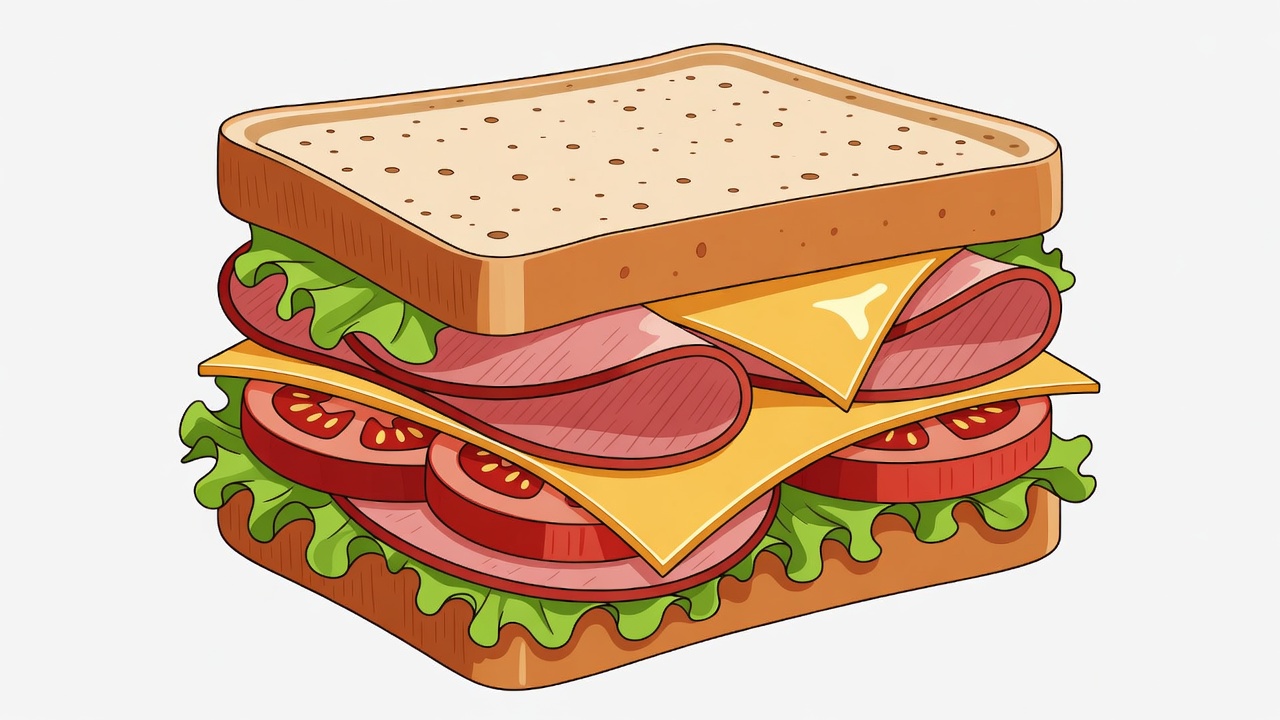 A colorful cartoon illustration of a stacked sandwich on a white background. It features sliced bread with layers of ham, yellow cheese, fresh lettuce, and red tomato slices. The sandwich is depicted in a 3D isometric view with vibrant details.