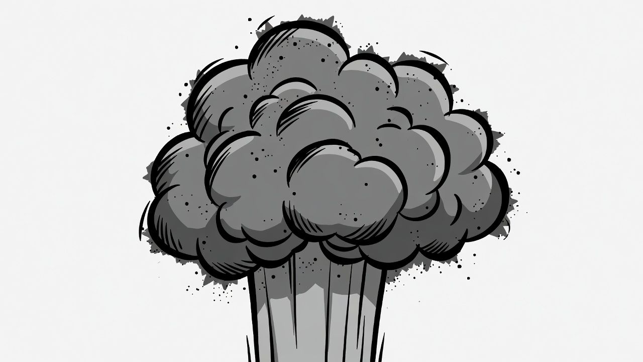 A black and white cartoon illustration depicts a large, billowing explosion cloud with jagged edges and scattered particles. The cloud rises prominently against a plain white background, isolated for easy use.