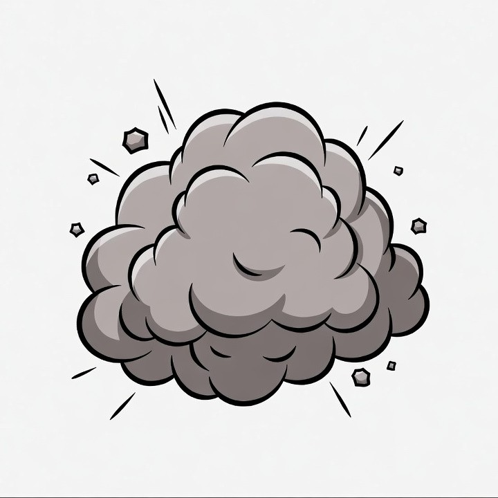 A cartoon-style explosion cloud is depicted in gray tones with thick black outlines. Bright stars and radiating lines emphasize the burst effect. It is isolated on a white background.
