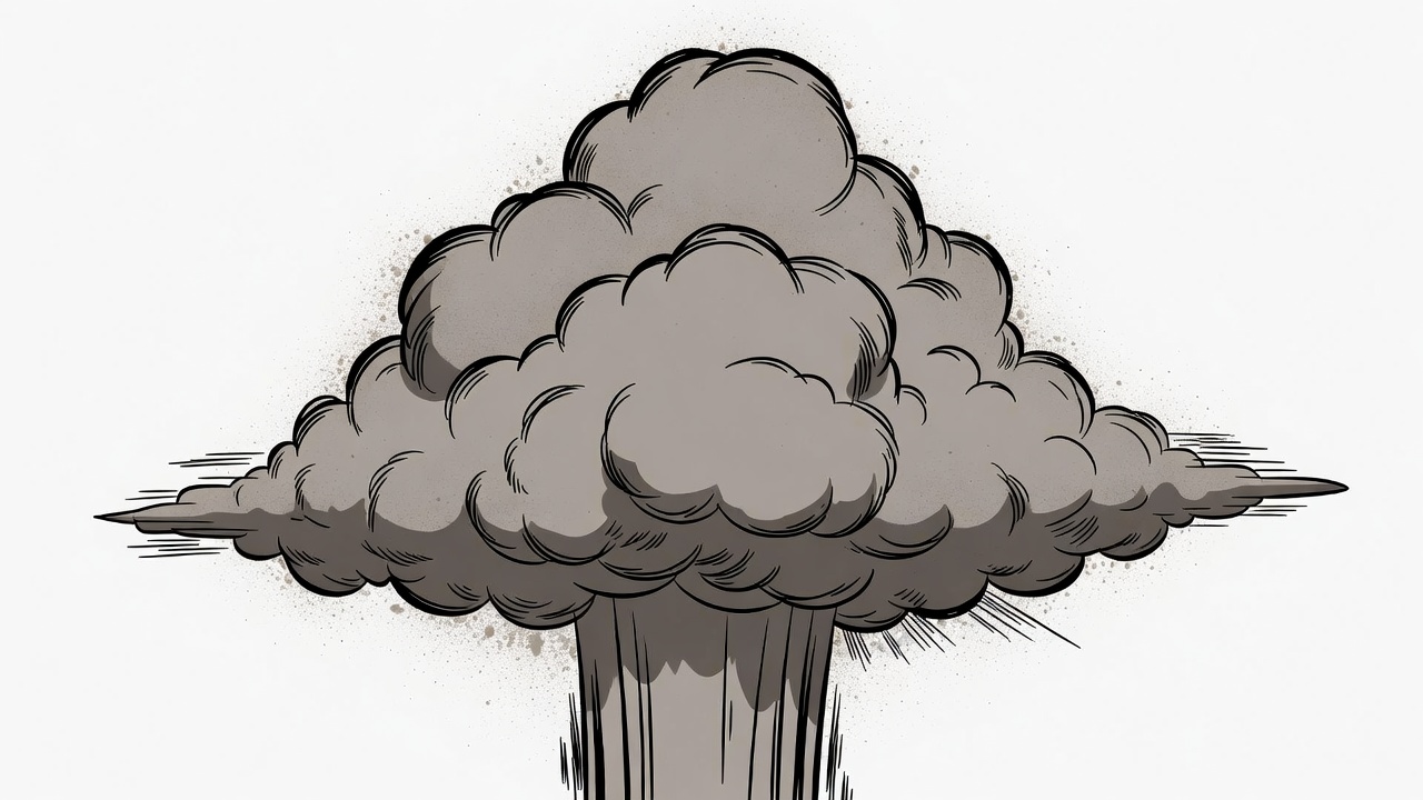 A detailed black and white cartoon illustration depicts a large, billowing explosion cloud with jagged edges and wispy trails. The cloud rises prominently from a wide base, featuring textured shading and dynamic bursts. It is isolated on a plain white background.